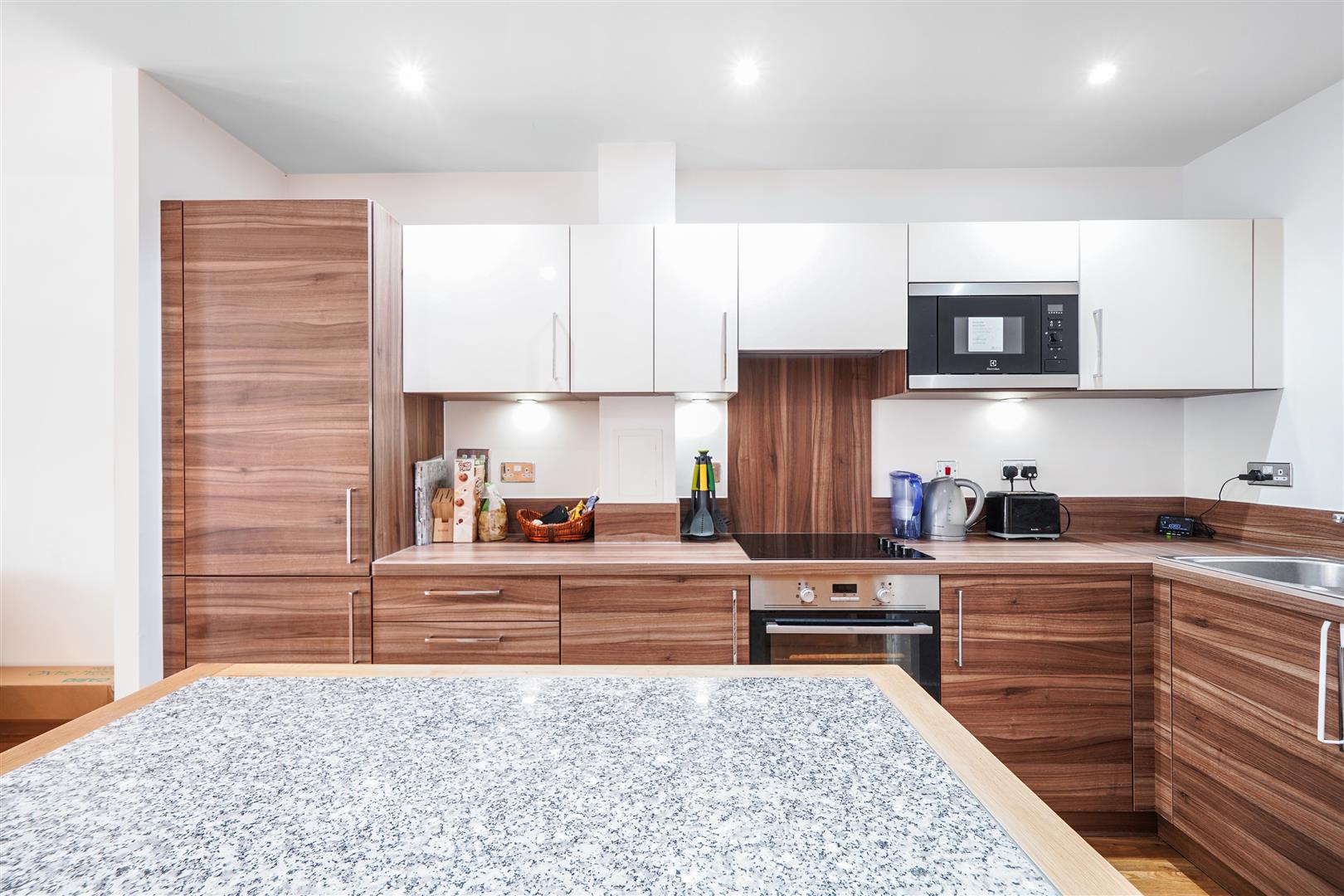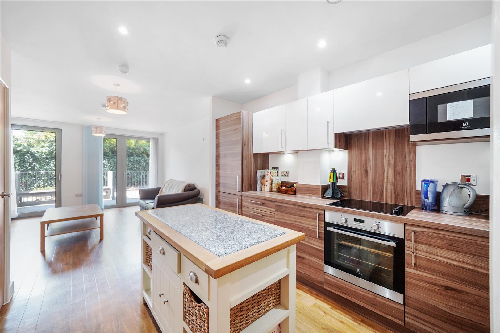 - Open-plan reception/kitchen with integrated appliances and island