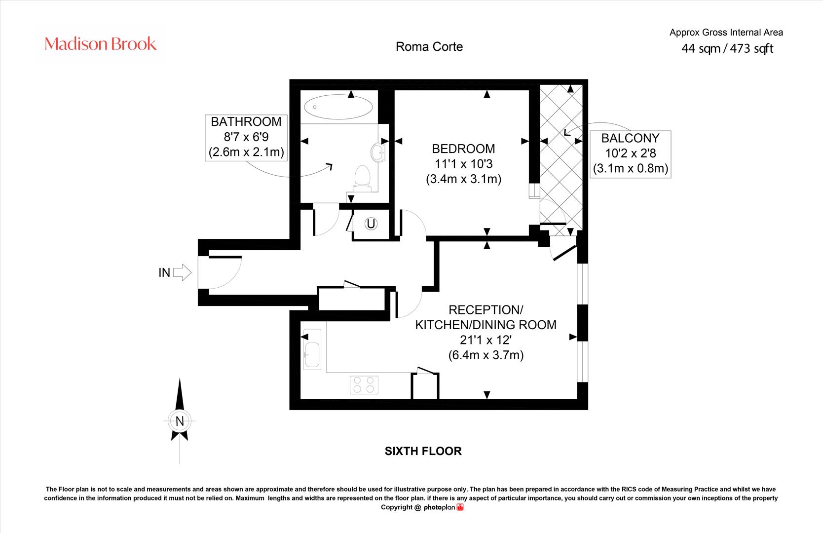 - Sixth-floor one-bedroom apartment (approx. 473 sq. ft.)