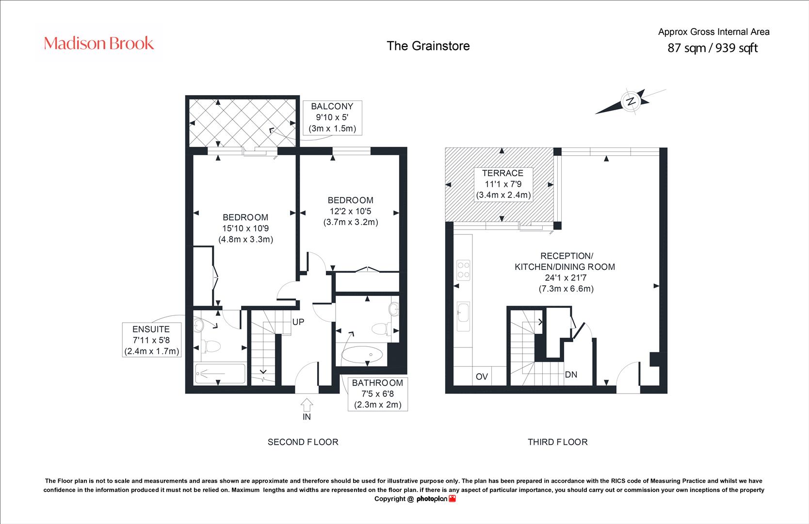 Measuring 939 sq. ft., the apartment unfolds across two spacious floors. The lower level hosts two well-proportioned double bedrooms, each finished with neutral décor and large windows for excellent natural light. The principal bedroom benefits from a sleek en-suite shower room and direct access to a private balcony, while the second bedroom is served by a modern family bathroom. Upstairs, a dramatic open-plan living and dining space forms the heart of the home, boasting double-height ceilings, exposed brickwork, and large industrial-style windows that create an exceptional sense of light and volume. The modern kitchen is fitted with integrated appliances and flows seamlessly to a private terrace.