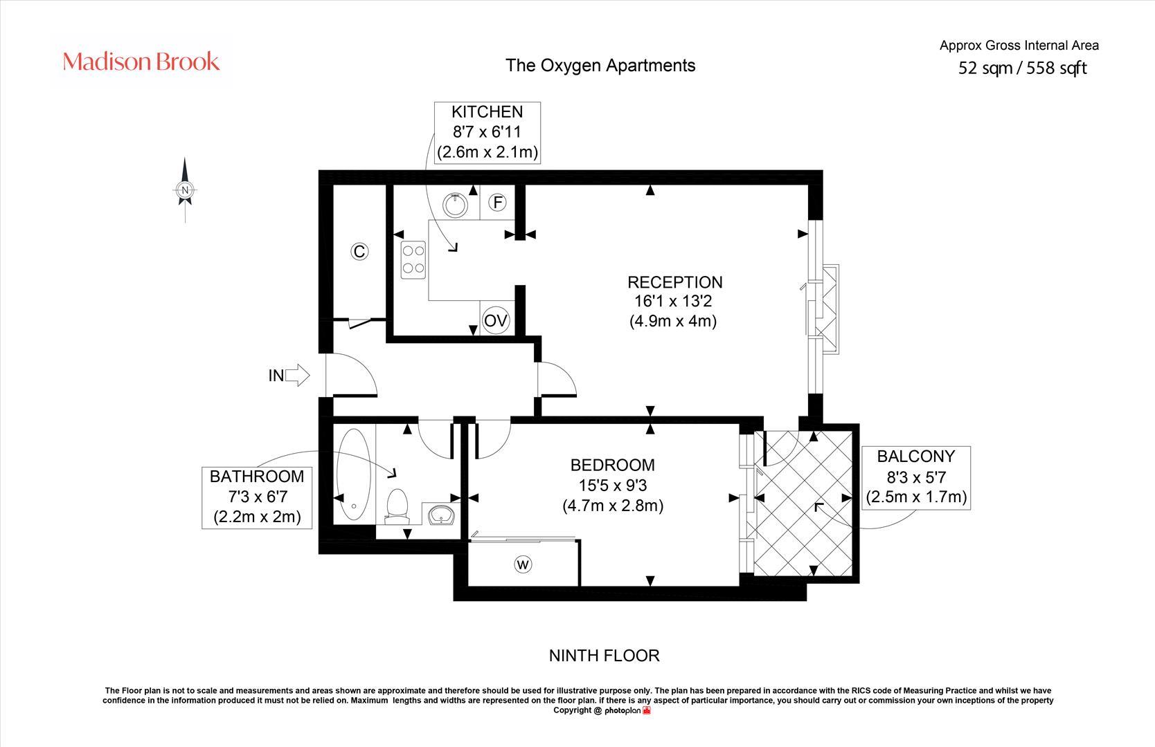 Situated on the ninth floor of the popular Oxygen Apartments, this well-presented one-bedroom apartment enjoys elevated views and an abundance of natural light. The home spans approximately 558 sq. ft. and features both a Juliette balcony and a private terrace with partial dock views.