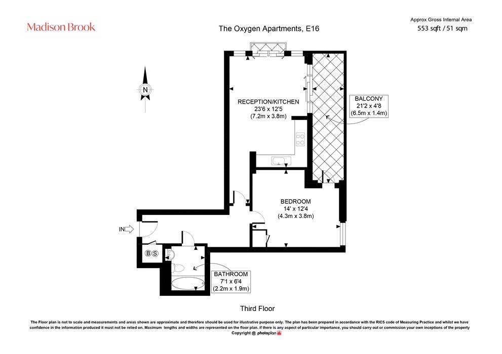 The property features a bright and airy open-plan living and kitchen area, fitted with integrated appliances and opening onto a spacious balcony, flooding the space with natural light throughout the day. A second Juliette balcony further enhances the sense of space and airiness. The accommodation is completed by a generous double bedroom, a three-piece family bathroom, and ample storage throughout.