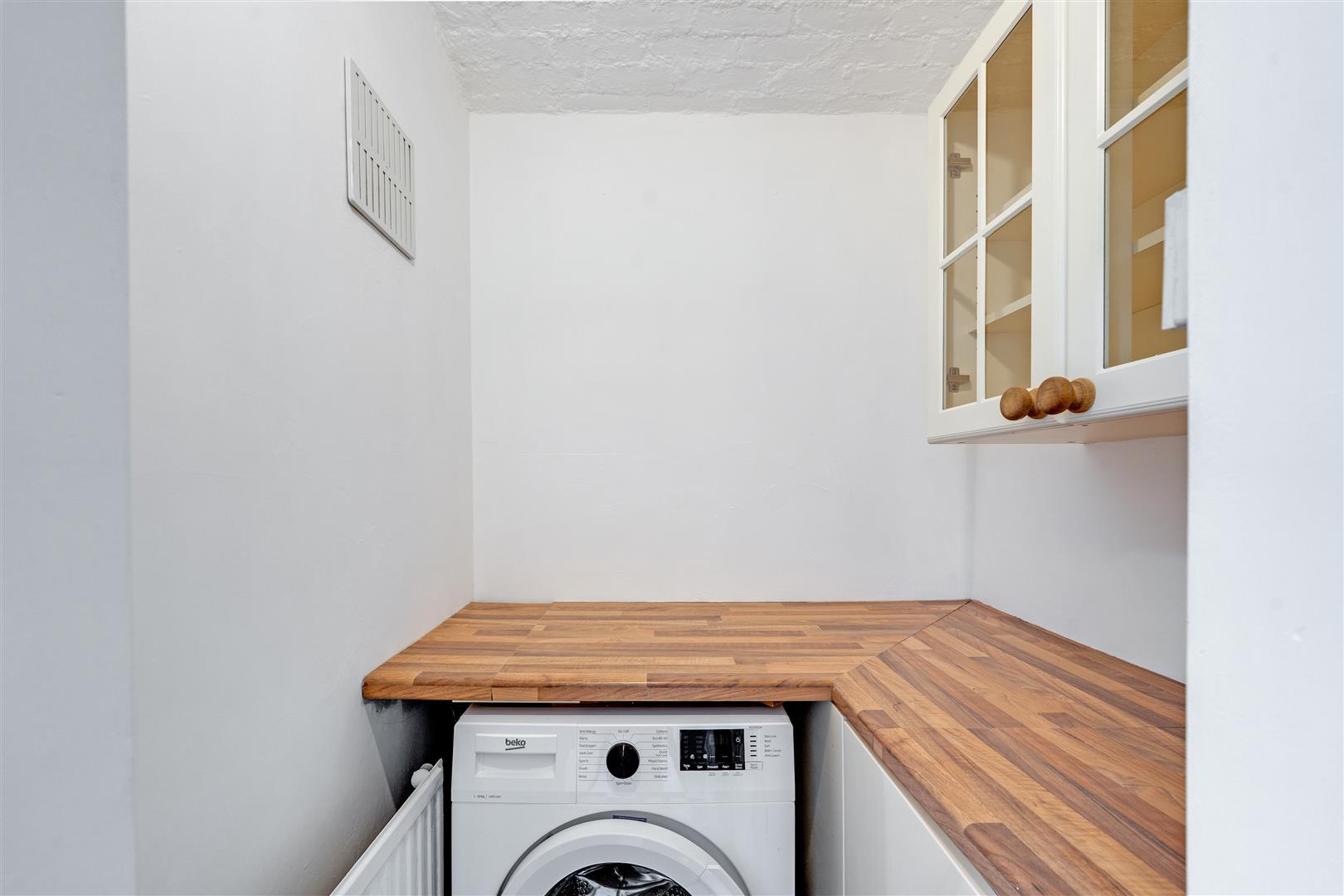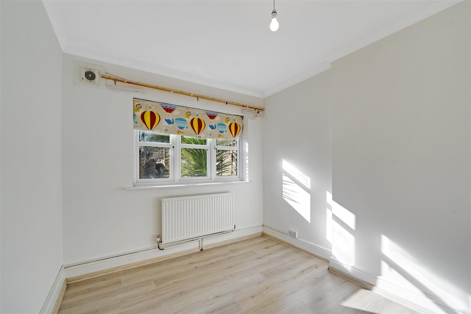 The property benefits from impressive room dimensions throughout, including a spacious living room and a principal bedroom. A second well-proportioned bedroom provides flexibility for guests, a home office or additional family accommodation. The separate kitchen offers practical storage and workspace, complemented by a family bathroom and useful utility area. To the rear, a substantial private garden extending to excellent outdoor space.