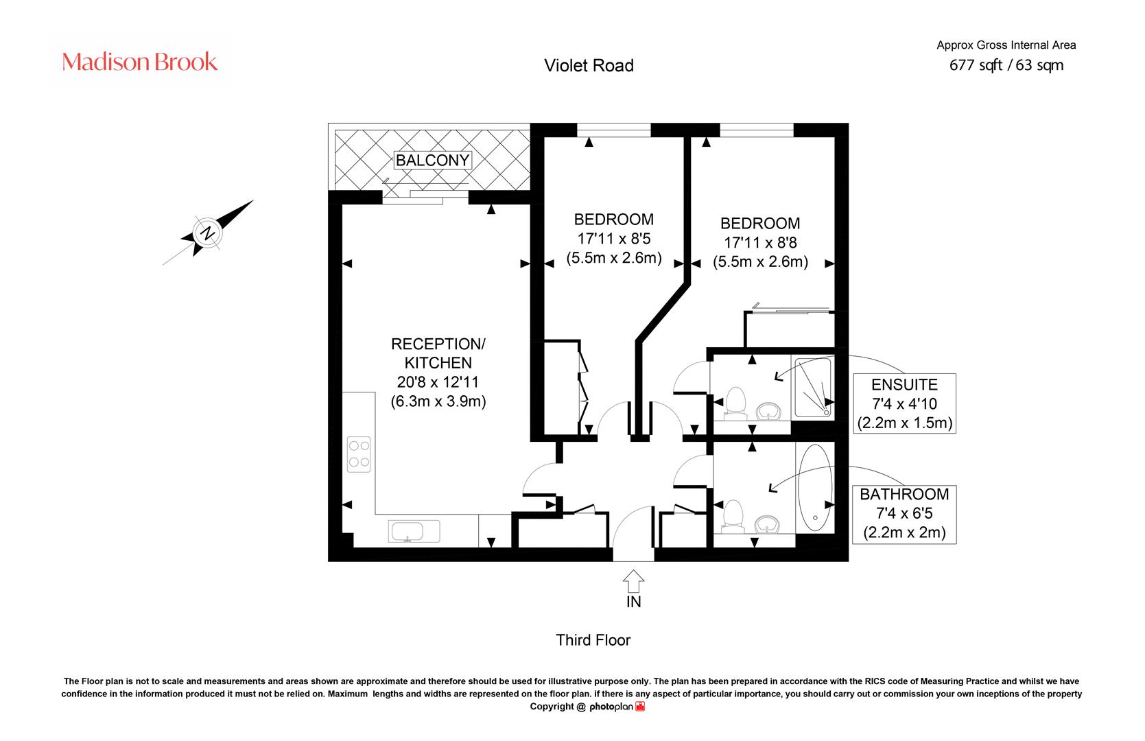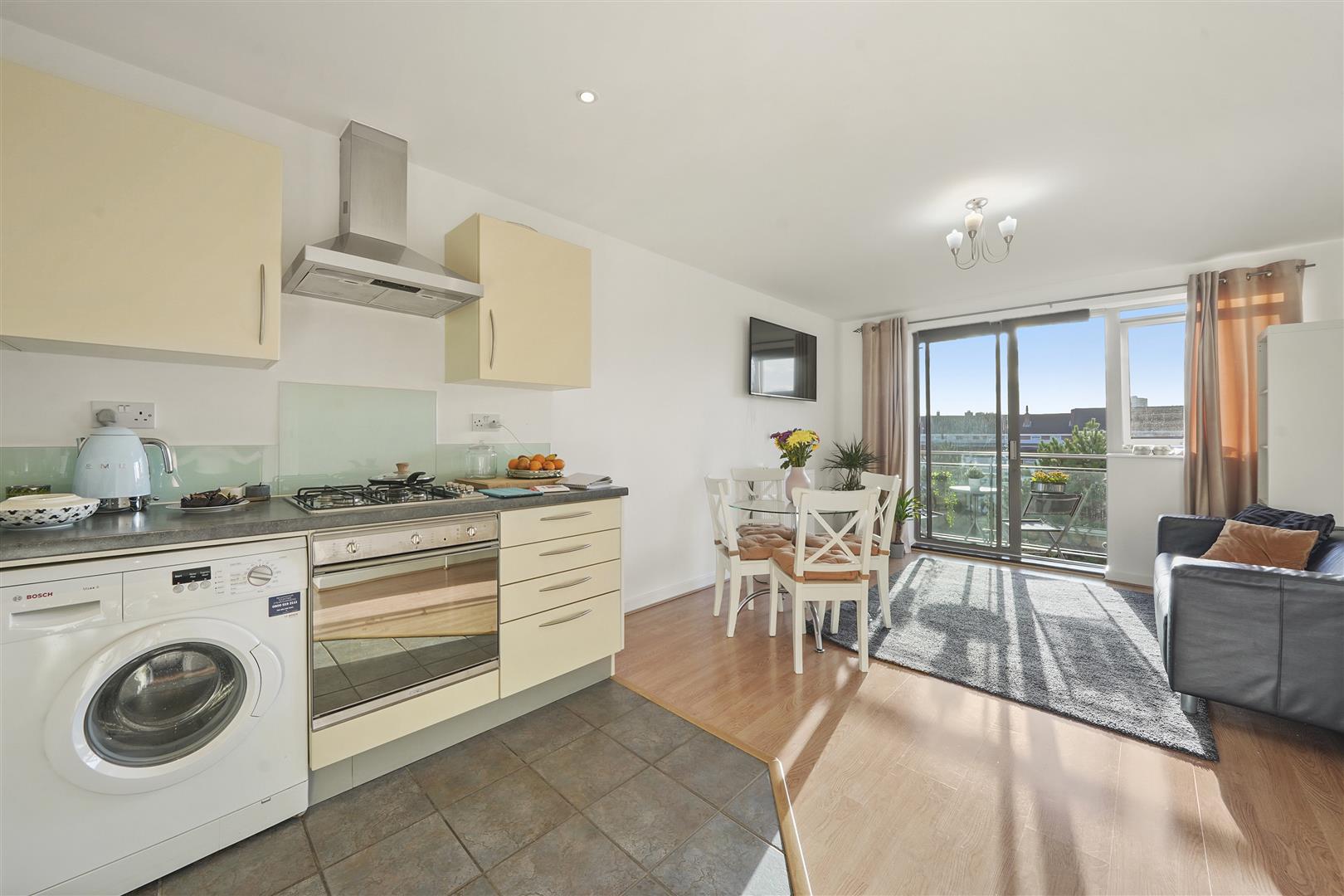 The property features a spacious open-plan reception, kitchen and dining area, providing an excellent living space with direct access to a private balcony. The kitchen is modern in design with fitted units and ample preparation space. The apartment comprises two generously sized double bedrooms, with the principal bedroom benefiting from a private en-suite shower room, while a separate family bathroom serves the rest of the property. The layout offers comfortable and practical living with a good balance between living and sleeping areas.